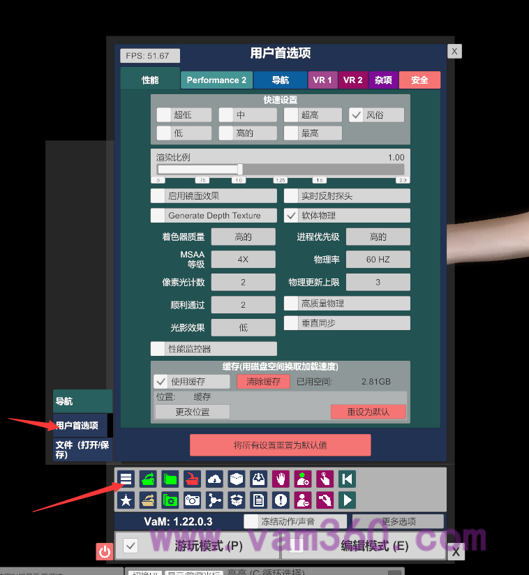 这里可以调整性能,电脑配置好,可以调整到 渲染比例最高, 配置差调整 渲染比例低。 根据自己的情况来。